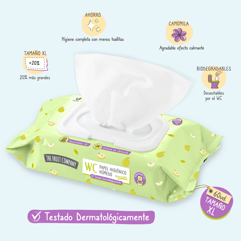 Lingettes WC The Fruit Company Papier toilette taille XL, avec un effet apaisant agréable et testé dermatologiquement, pour une hygiène complète. Chaque paquet contient 60 unités de lingettes humides parfumées à la pomme.